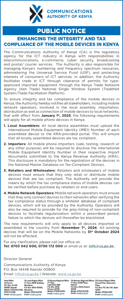 It means all new mobile devices imported, assembled, or sold in Kenya starting November 1, 2024, shall be subject to this directive by the CA. Importers and local assemblers shall be required to register IMEI numbers with the Kenya Revenue Authority, while it allows retailers to sell only those tax-compliant gadgets. For these devices, the IMEI number shall be verified by the MNOs before allowing such devices to connect to their network.