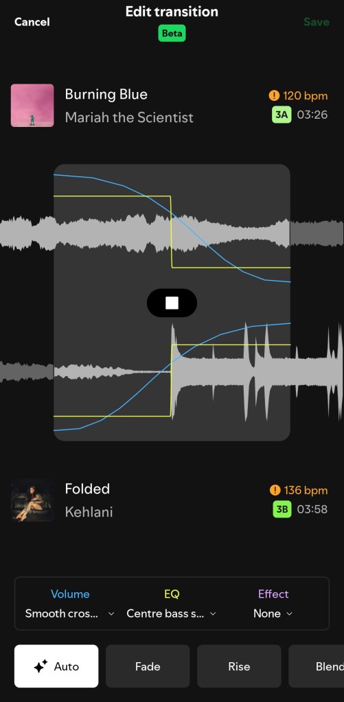 - Choose Auto or Manual – Auto applies quick transitions, while Manual lets you dive into EQ, volume, and waveform data.