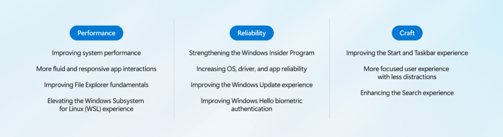 On the experience side, Microsoft is placing emphasis on “craft” focusing on usability, polish and personalization. Changes are expected across the Start menu and Taskbar, with more flexibility and customization, alongside a quieter, less distracting experience overall. Widgets, notifications and setup processes are being streamlined, while search is being improved to deliver faster, clearer and more consistent results across the system.